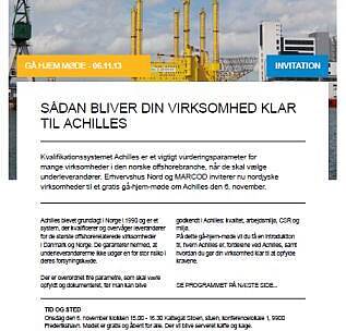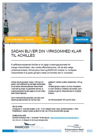 Achilles blevet grundlagt i Norge i 1990 og er et system, der kvalificerer og overvåger leverandører for de største offshorerelaterede virksomheder i Danmark og Norge. De garanterer hermed, at underleverandørerne ikke udgør en for stor risiko i deres forsyningskæde. Der er overordnet fire parametre, som skal være opfyldt og dokumenteret, før man kan blive godkendt i Achilles: kvalitet, arbejdsmiljø, CSR og miljø. På dette gå-hjem-møde vil du få en introduktion til, hvem Achilles er, fordelene ved Achilles, samt hvordan du gør din virksomhed klar til at opfylde kravene.