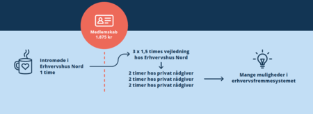 I vores iværksætterpakke er der et intromøde af én time. Ønsker du at gå videre, kan du få adgang til StartUp Club. Her får du 3 x 1,5 times vejledning hos en af vores erhvervskonsulenter samt adgang til to timers vejledning hos tre private rådgivere fx revisor, advokat, markedsføring, som står til rådighed i StartUp Club. For at få adgang til StartUp Club, skal du være medlem i Skagen, Frederikshavn eller Sæby Erhvervsforening.