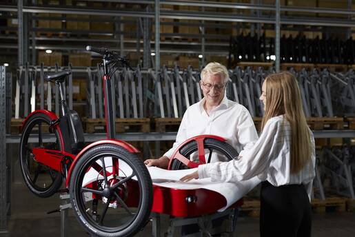 Stel og fælge er støbt i 100 procent genanvendeligt aluminium fra hhv. Thisted og Svendborg - et materiale som er utrolig let, slidstærkt og ikke ruster. Vores genanvendte plastkasse kommer fra en virksomhed på Sjælland. Og cyklen bliver pulverlakeret i Bindslev. Cyklen bliver samlet her på vores fabrik i Frederikshavn, hvor det er direkte med til at sikre 22 arbejdspladser. Så vi kommer rundt i hele Danmark, og vi er stolte af at skabe danske arbejdspladser,” fortæller Uffe A. Olesen.